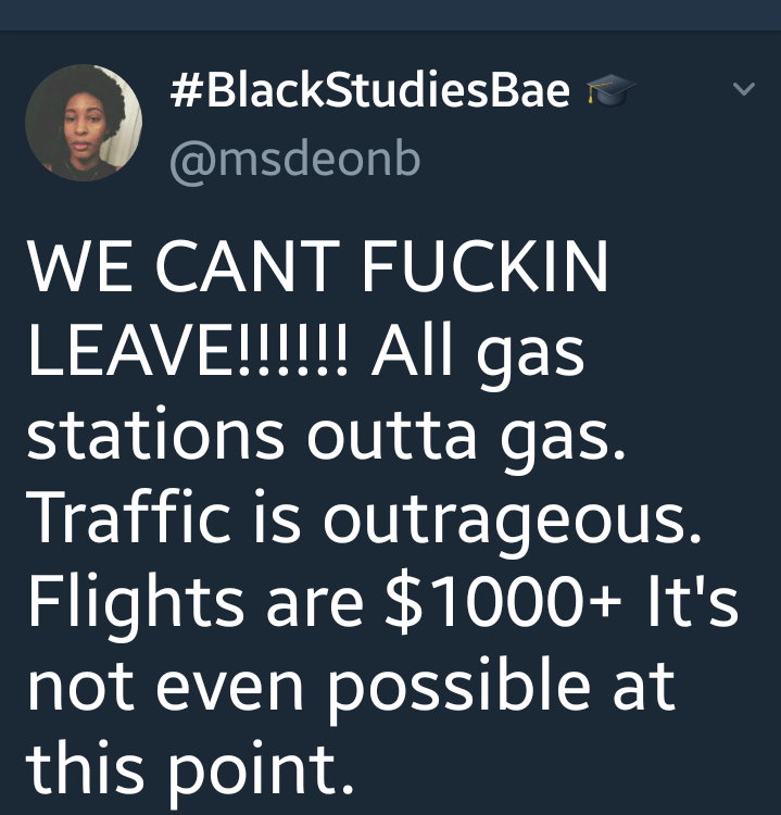 Their are people here who don’t have the finances to jump up and leave, some people haven’t got paid yet do there is an issue right there, there are people who can’t afford the airline prices when they were charging 1000+ a ticket. So here comes jet blue and american airlines who capped theirs at 99.00 but still there are people here who are on fixed incomes and have more than one or two chidren, sick family members who are unable to moved but people want to get online and judge people from the comfort of their state who is not under a hurricane watch. This is an unexpected expense that most don’t have because they are living pay check to paycheck paying 1000 or more in rent, utilities and other expenses to make it.