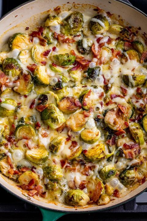 Remove pan from heat, pour in heavy cream. Sprinkle shredded cheddar and gruyere cheese all over the Brussels sprouts. Top with crumbled bacon and bake about 12 minutes, until cheese is melted and bubbly.